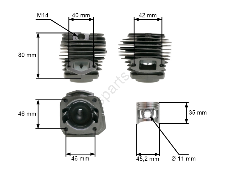 Obsah balenia: 1x valac, 1x piest, 1x piestny čap, 2x pojistný krúžok, 2x piestny krúžok, 3x tesnenie, 4x skrutka valca, 1x ojničné ložisko