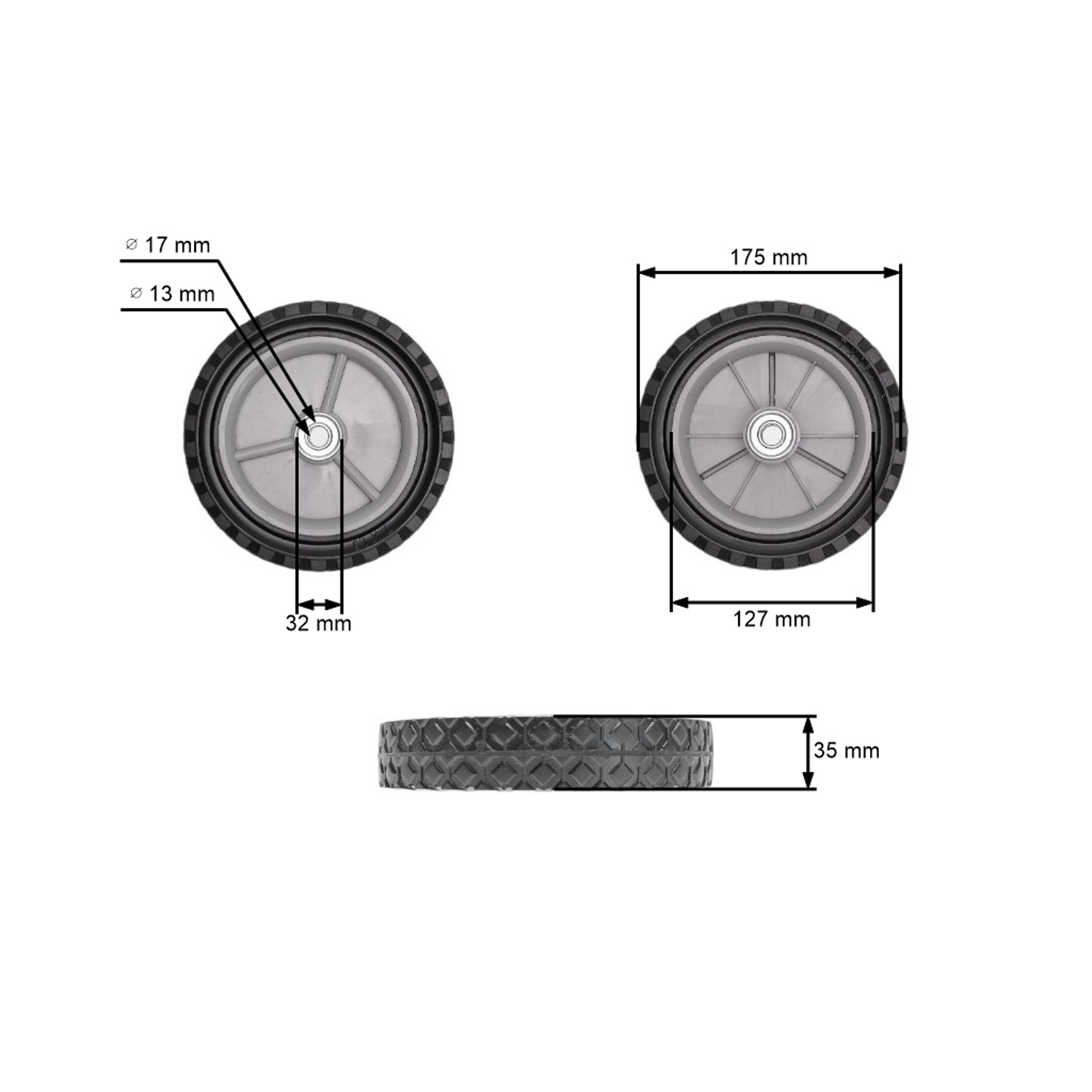 Popis a špecifikácia produktu: Univerzálne plastové koleso s ložiskom pre záhradné kosačky priemer 175 mm gumová pneumatika